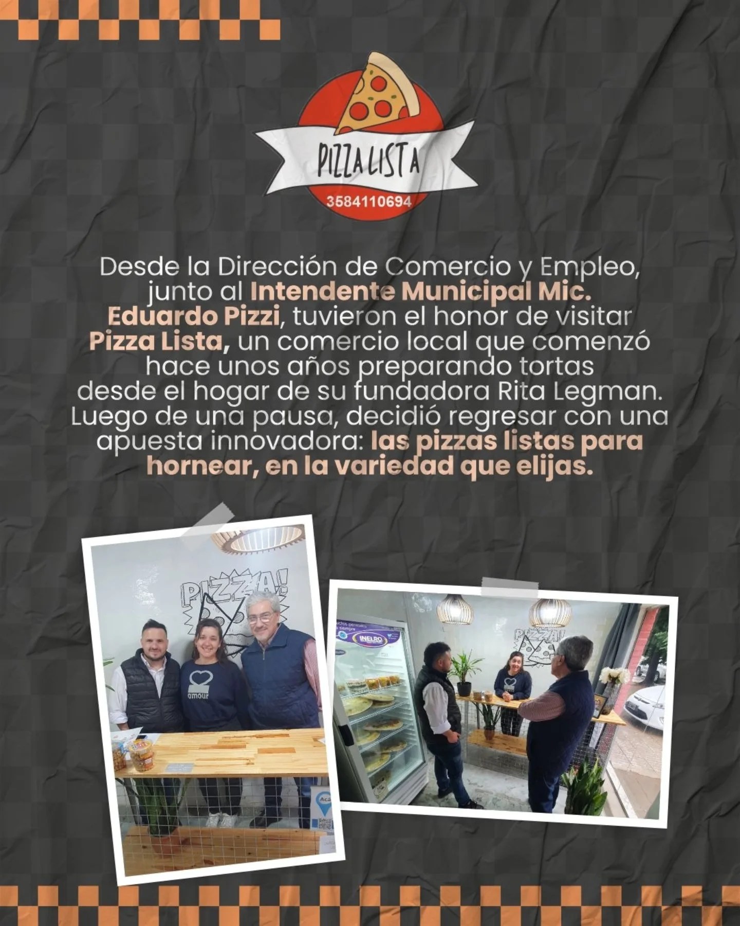 El Intendente Municipal, Mic. Eduardo Pizzi, junto MartÃn Crivello, Director de Comercio y Empleo, visitaron @pizza.lista1 , el comercio de @legmanrita . Rita comenzó su camino emprendedor hace algunos años, preparando tortas desde su hogar, posteriormente, hizo una pausa en su carrera como emprendedora y decidió regresar con una apuesta innovadora: las pizzas listas para hornear, en la variedad que elijas.