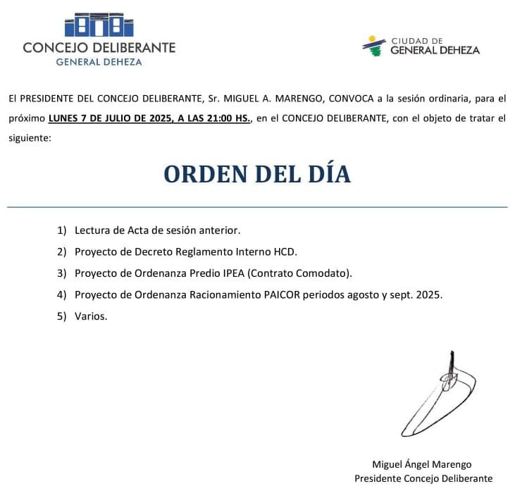 El próximo lunes 7 de julio a las 21 horas en la Sala del Honorable Concejo Deliberante, se llevará a cabo una nueva Sesión Ordinaria, en la cual se tratarán los siguientes temas de relevante importancia.