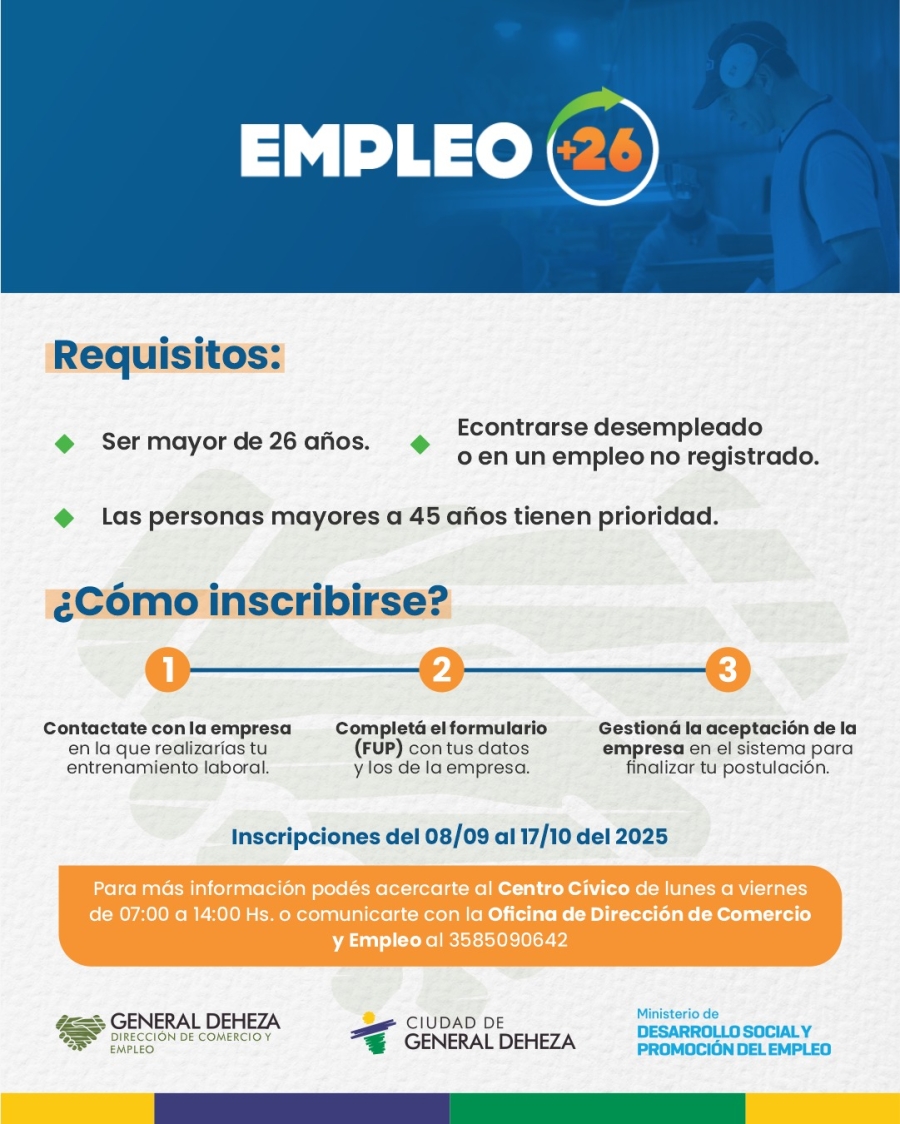 El Gobierno de Córdoba puso en marcha el programa Empleo +26, una iniciativa que busca crear trabajo genuino para mayores de 26 años que se encuentren desempleados y asà promover su integración en el mercado laboral. Son prioridad las personas con 45 años de edad.