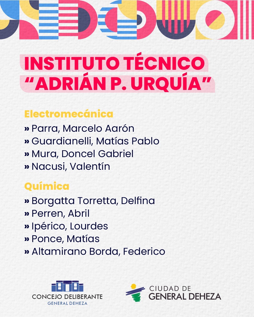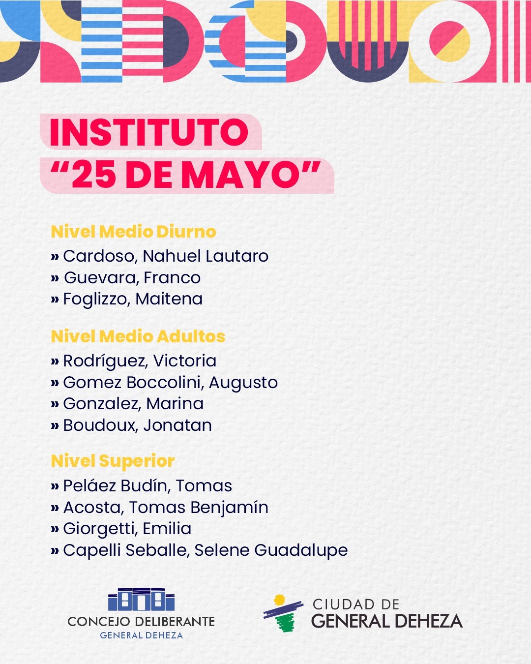 En esta nota sintetizamos en placas los nombres de las Instituciones Educativas de General Deheza y sus Alumnos Destacados 2025.