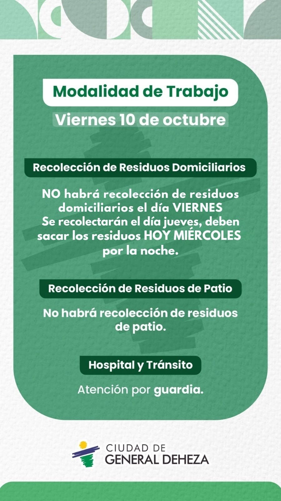 #ServiciosPúblicos #DÃasYHorarios #MunicipalidadDeGeneralDeheza