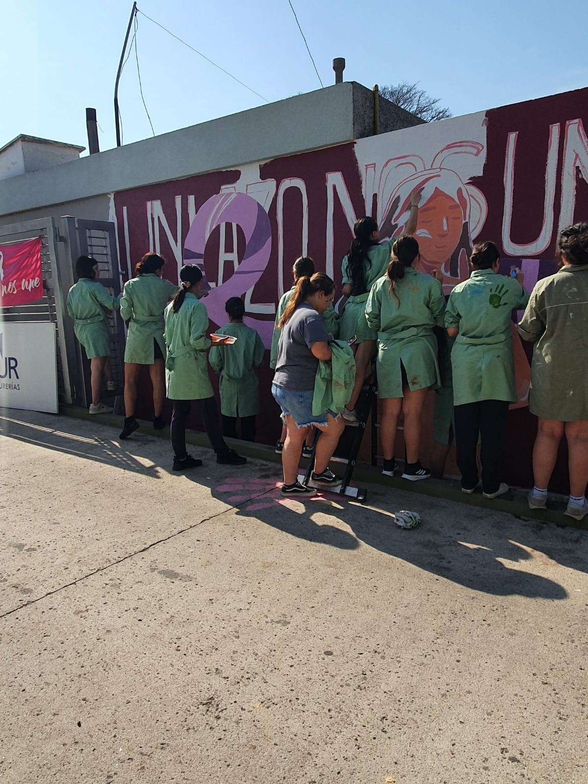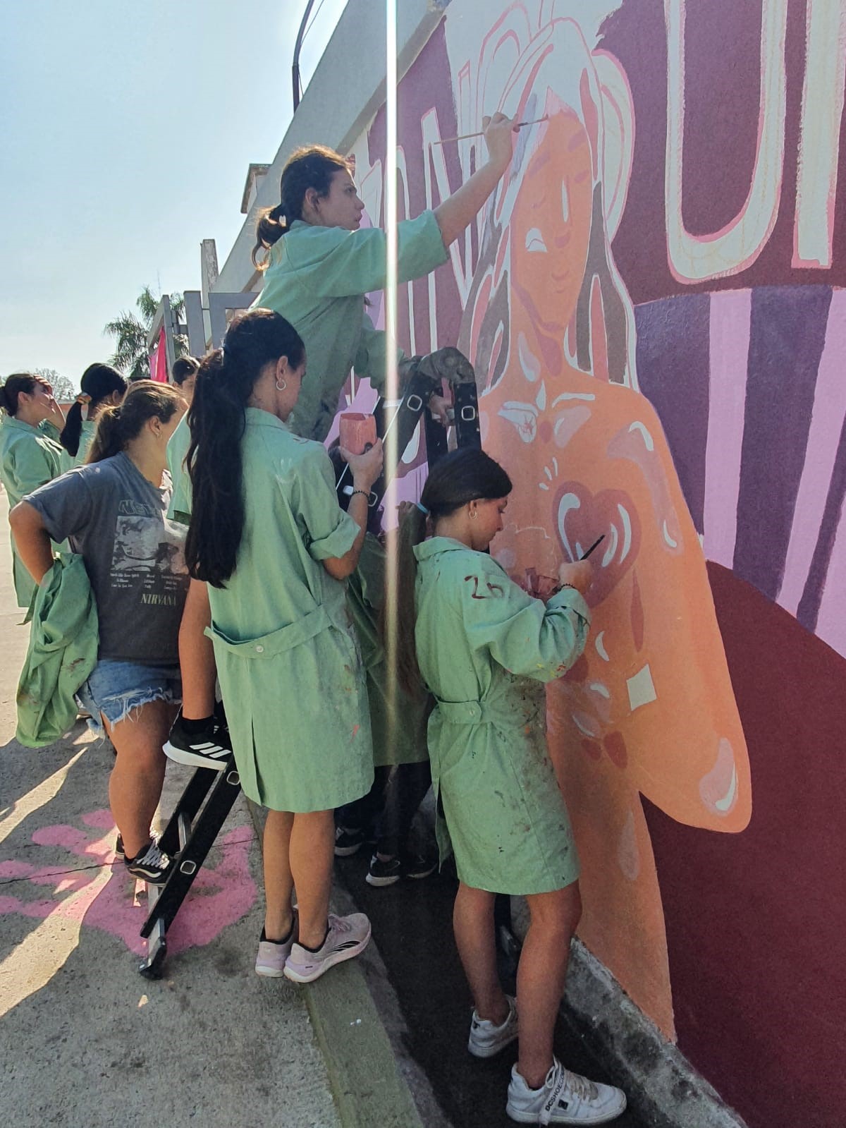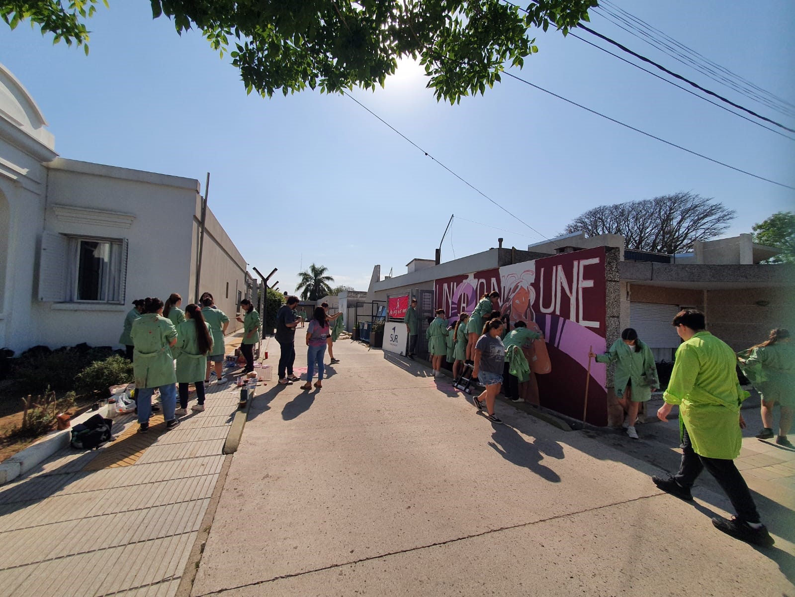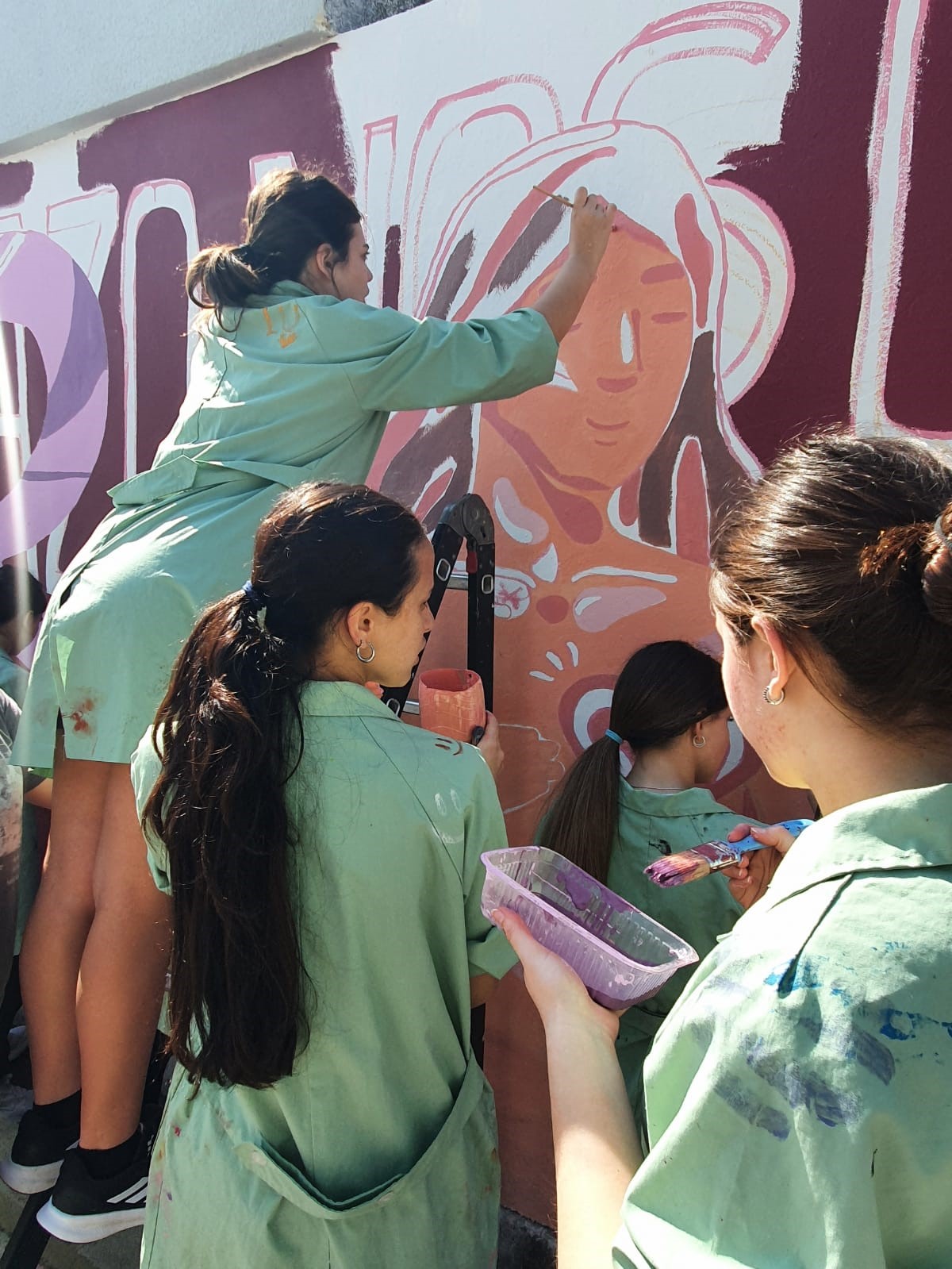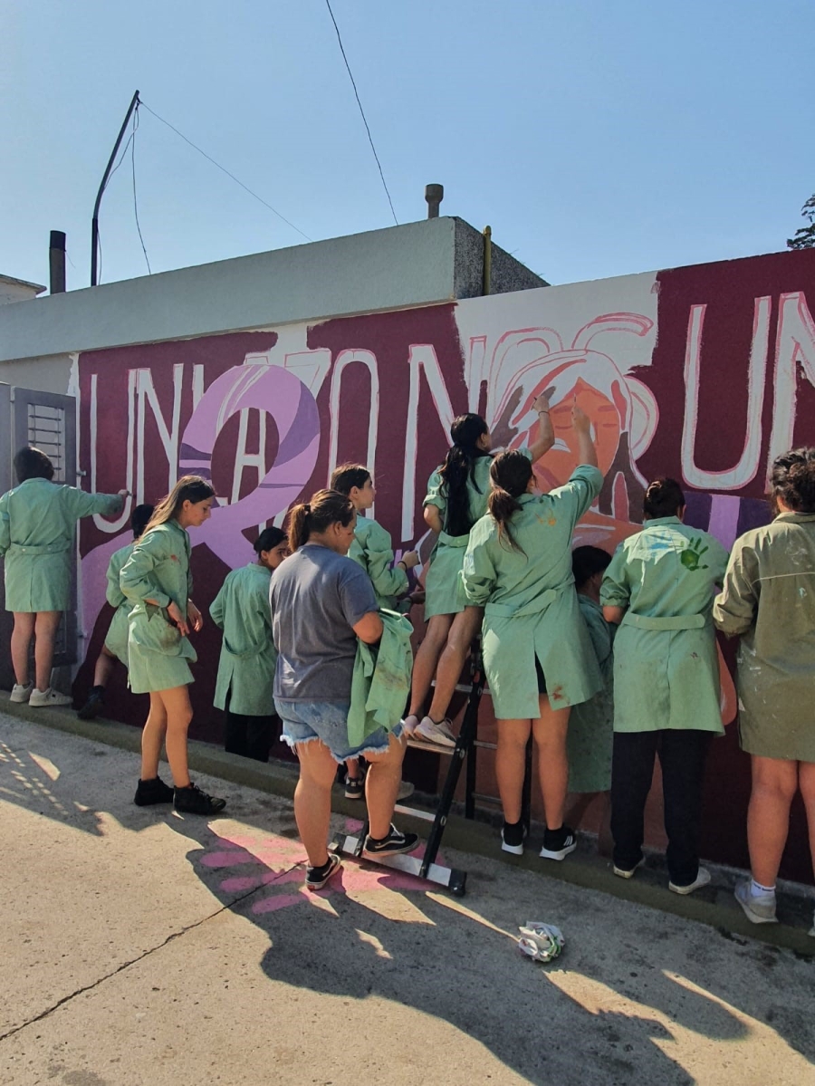 Alumnos de 6to. año de Arte Artes Visuales del Instituto Técnico "Adrián P. UrquÃa", durante la mañana de hoy, le están dando color al diseño realizado en el marco de Octubre Rosa y Un Lazo Nos Une.