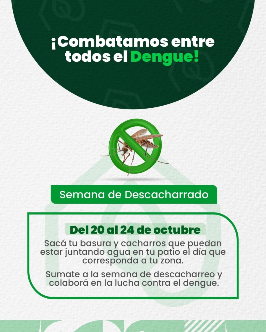 Del lunes 20 al viernes 24 de octubre, llevamos adelante una nueva campaña de descacharrado en toda la ciudad, con el objetivo de prevenir el dengue y cuidar nuestra salud.