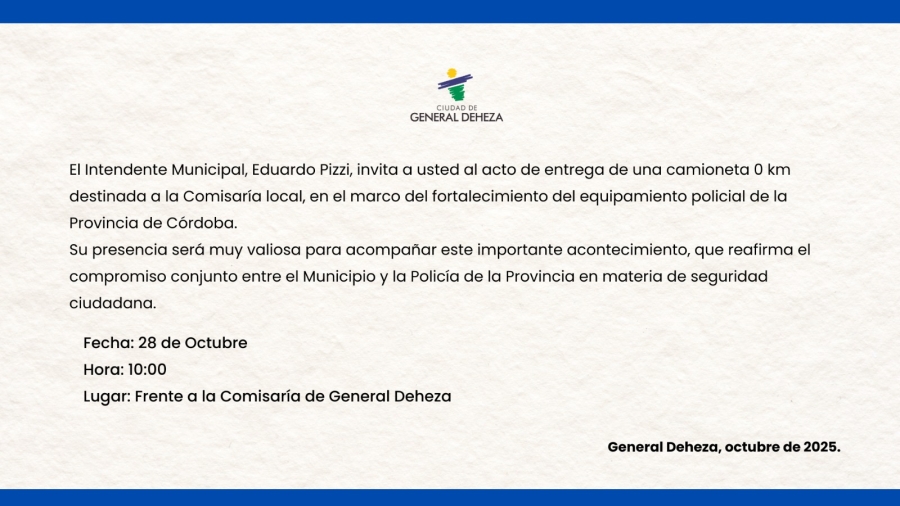 El Acto de entrega se llevará a cabo, este martes 28 de octubre a la hora 10, frente al Municipio. En el mismo, contaremos con la presencia de Autoridades Municipales, Departarmentales y Policiales.
