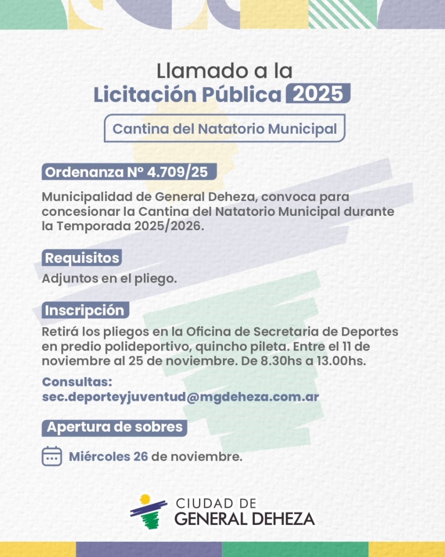 La Municipalidad de General Deheza convoca a interesados para concesionar la Cantina del Natatorio Municipal durante la temporada 2025/2026.