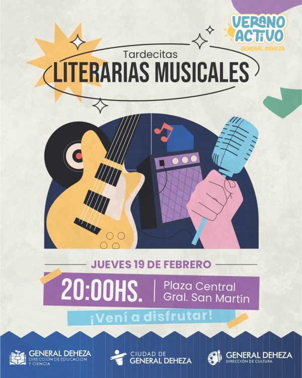 ¡Agendalo ya! Segunda edición de las Tardecitas Literarias Musicales. Jueves 19 de febrero | 20 horas I Plaza Central Gral. San Martín #DirecciónDeCultura #DirecciónDeEducaciónYCiencia #MunicipalidaDeGeneralDeheza
