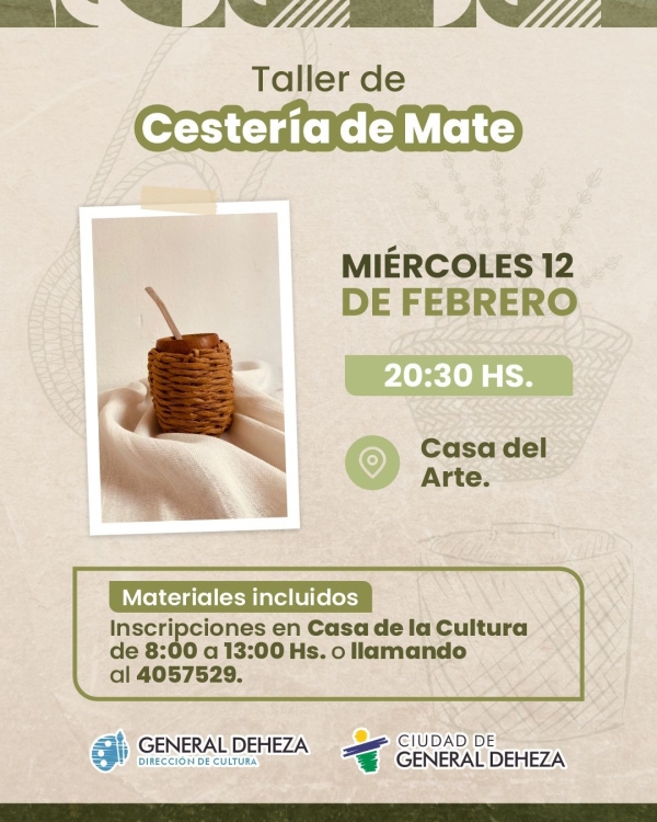 ¡Manos a la obra! Sumate al Taller de Cestería de Mate y aprendé a crear piezas únicas con tus propias manos. ? Miércoles 12 de febrero | ⏰ 20:30 horas ? Casa del Arte ? Inscribite en Casa de la Cultura de 8 a 13 horas…