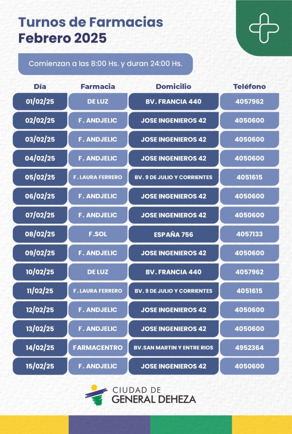 ¡Ante una emergencia fuera del horario de comercio, aquí las Farmacias de Turno! #MunicipalidadDeGeneralDeheza #FarmaciasDeTurno
