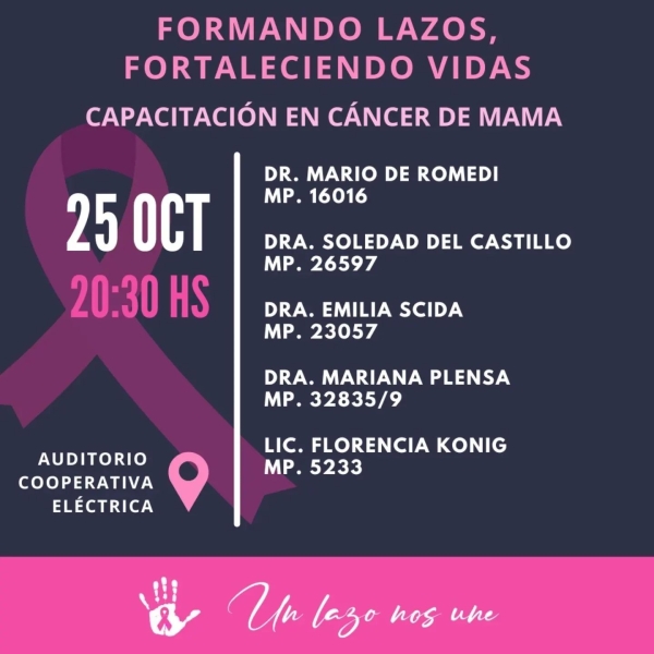 Formando lazos, fortaleciendo vidas Capacitación en Cáncer de Mama Viernes 25 de octubre 20:30 Auditorio de la Cooperativa Eléctrica En el marco de los 10 años de *Un Lazo Nos Une* , te invitamos a una charla con especialistas sobre la prevención y el tratamiento del cáncer de mama. …