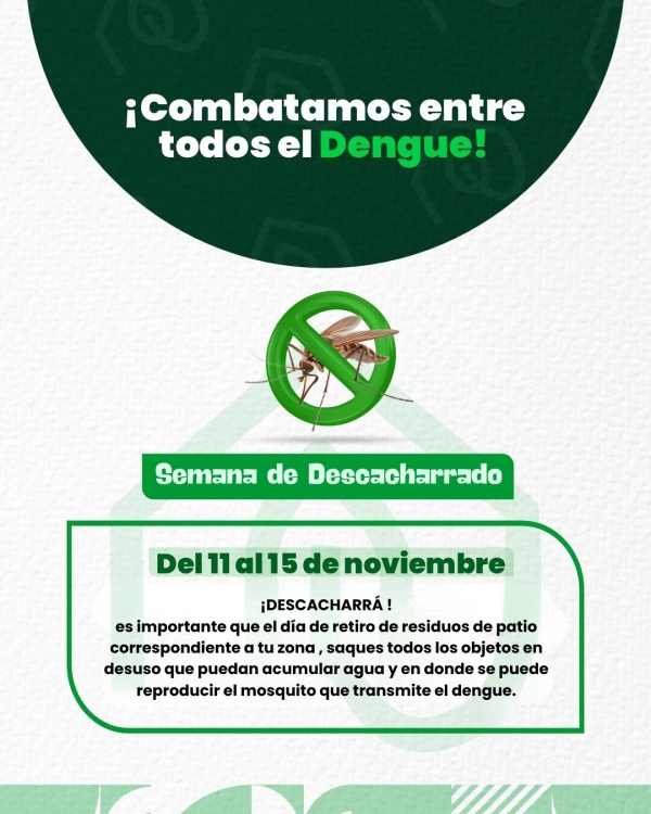 ¡Al dengue los combatimos entre todos! Aprovechá esta oportunidad para revisar tu casa y deshacerte de recipientes que acumulen agua, como cubiertas, botellas, baldes, etc. Con tu ayuda, podemos detener la propagación del mosquito transmisor del dengue. Un cacharro menos es un paso hacia una comunidad más sana y…