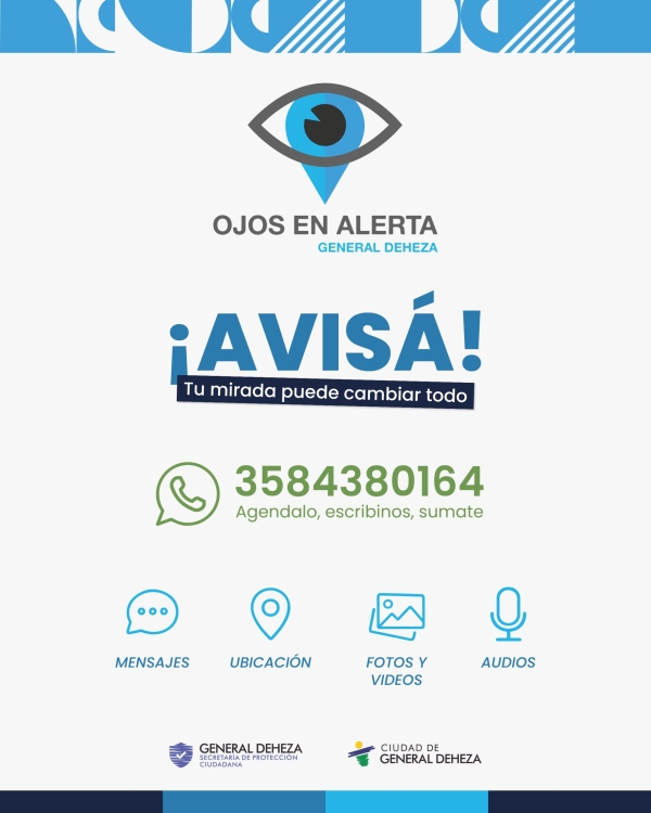 OJOS EN ALERTA — GENERAL DEHEZA Si ves algo sospechoso, avisar es simple y rápido. Con un solo WhatsApp podés ayudar a prevenir delitos y cuidar entre todos, nuestra ciudad. Enviá un mensaje con ubicación, fotos, videos o audios. El Centro de Monitoreo actúa de inmediato.…