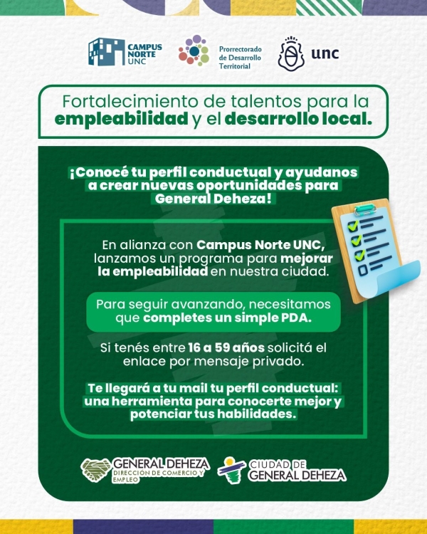 En alianza con Campus Norte UNC, lanzamos un plan para mejorar la empleabilidad local. Si tenés entre 16 y 59 años, sumate completando un PDA. Pedinos el link por privado y recibí en tu mail tu perfil conductual: una herramienta para conocerte y potenciar tus habilidades. ¡Tu…